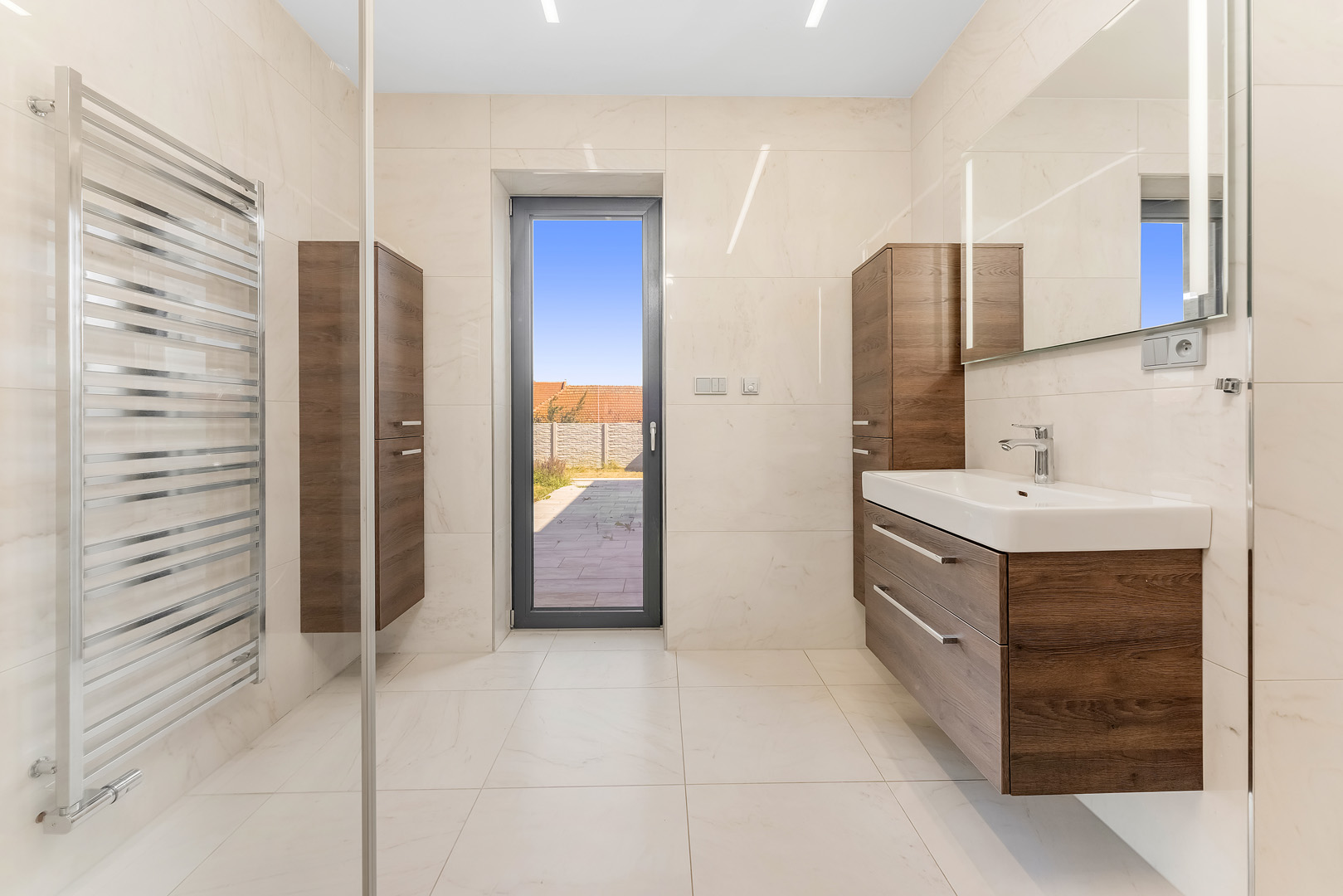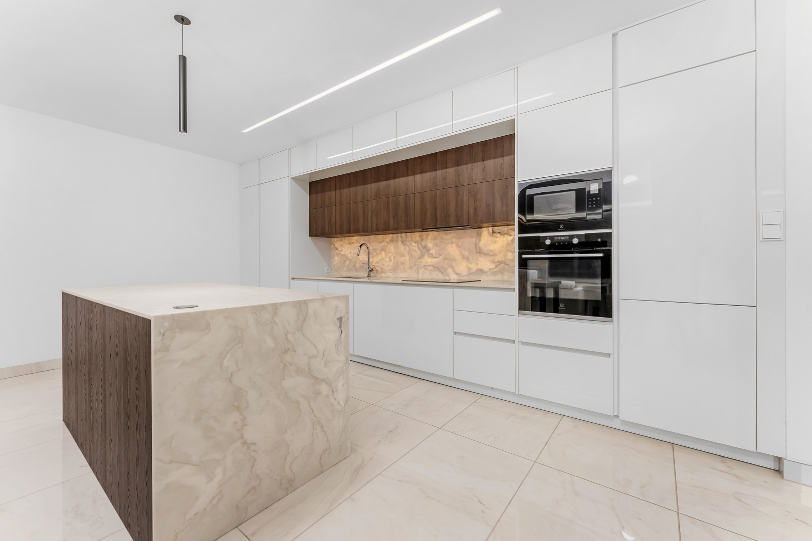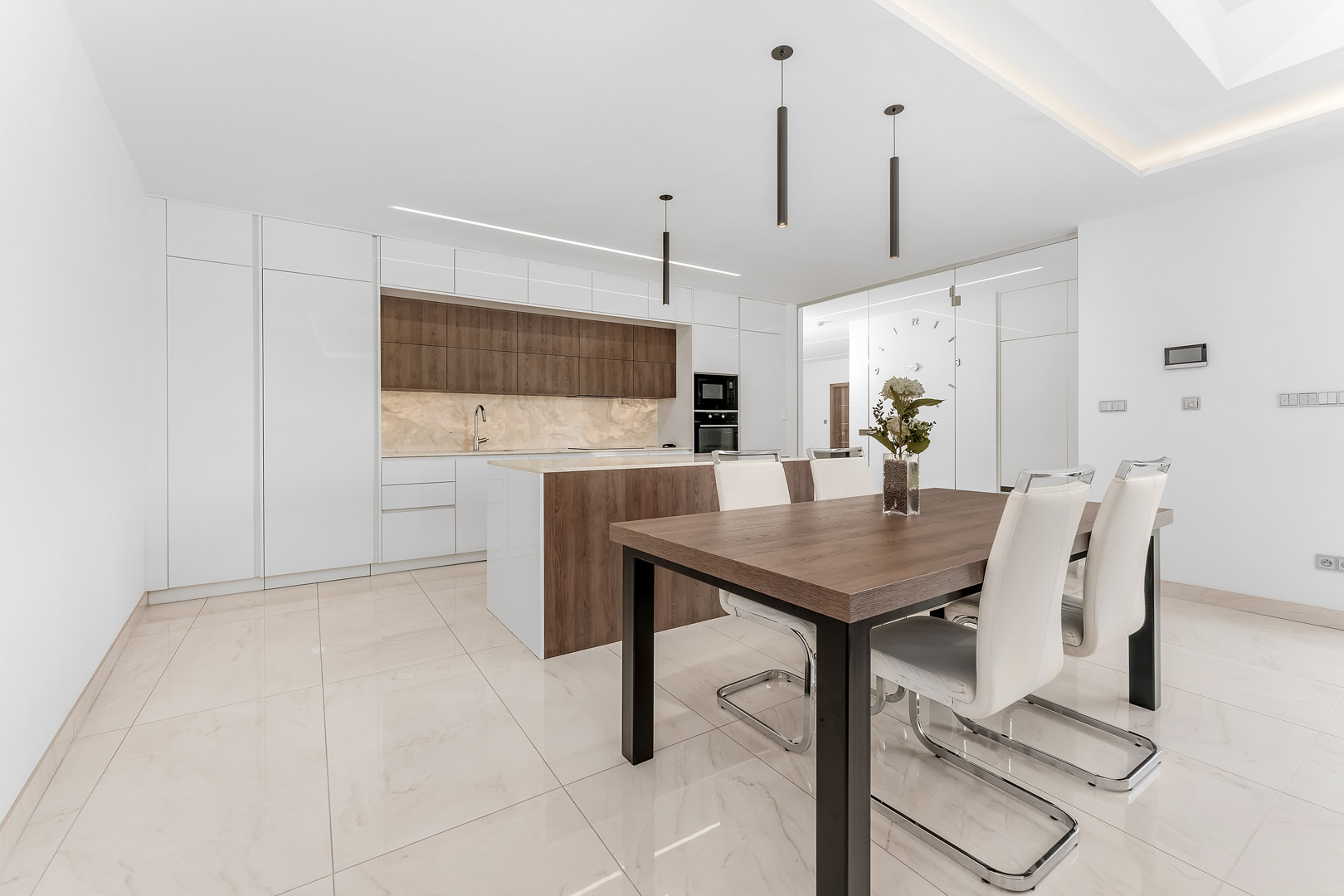 Srdcem domu je prostorná kuchyň propojená s jídelnou a obývacím prostorem. Moderní kuchyňská linka s ostrůvkem a tajnou spíží je navíc doplněna stylovým kvarcitovým pracovním povrchem. V celém domě dominují velkoformátové obklady. Skleněné komponenty, jako jsou zábradlí a prosklené stěny, propůjčují interiéru lehkost a vzdušnost. Dům byl navržen s ohledem na detail a praktičnost, což se odráží v minimálních provozních nákladech.